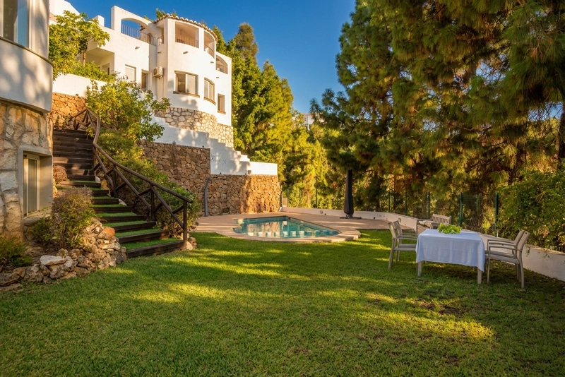 Loop naar buiten en de privétuin omhult de woning met volwassen groen en gazon. Dit is geen smal terras met twee potten — het is een echte tuin, het soort waar je doorheen kunt lopen, een tafel voor het diner kunt dekken, kinderen op het gras kunt laten rennen. Het privézwembad ligt erin, omlijst door pijnbomen en houten trappen die naar het huis leiden.